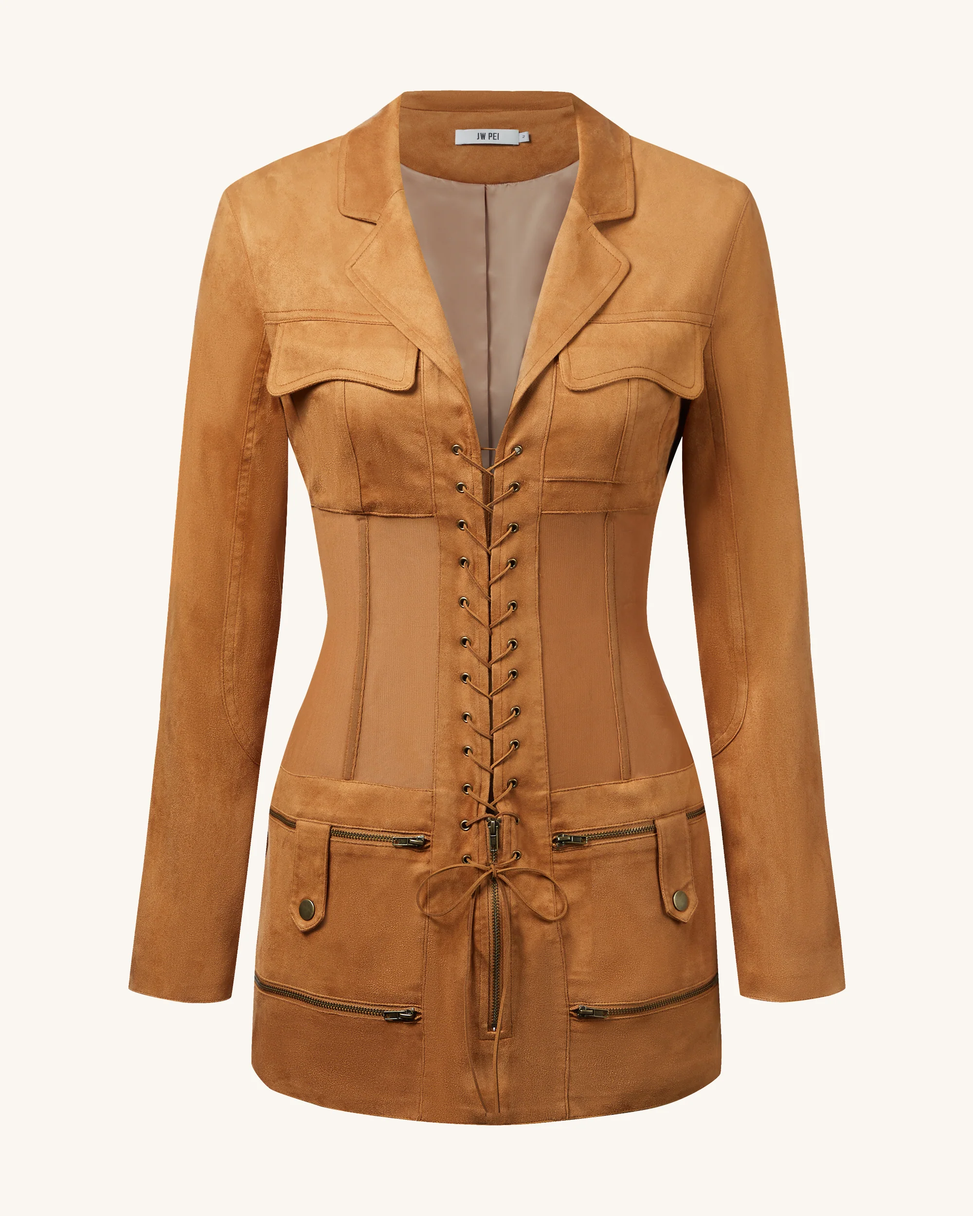 -65%Faux Suede Corset Jacket Mini Dress - Camel—