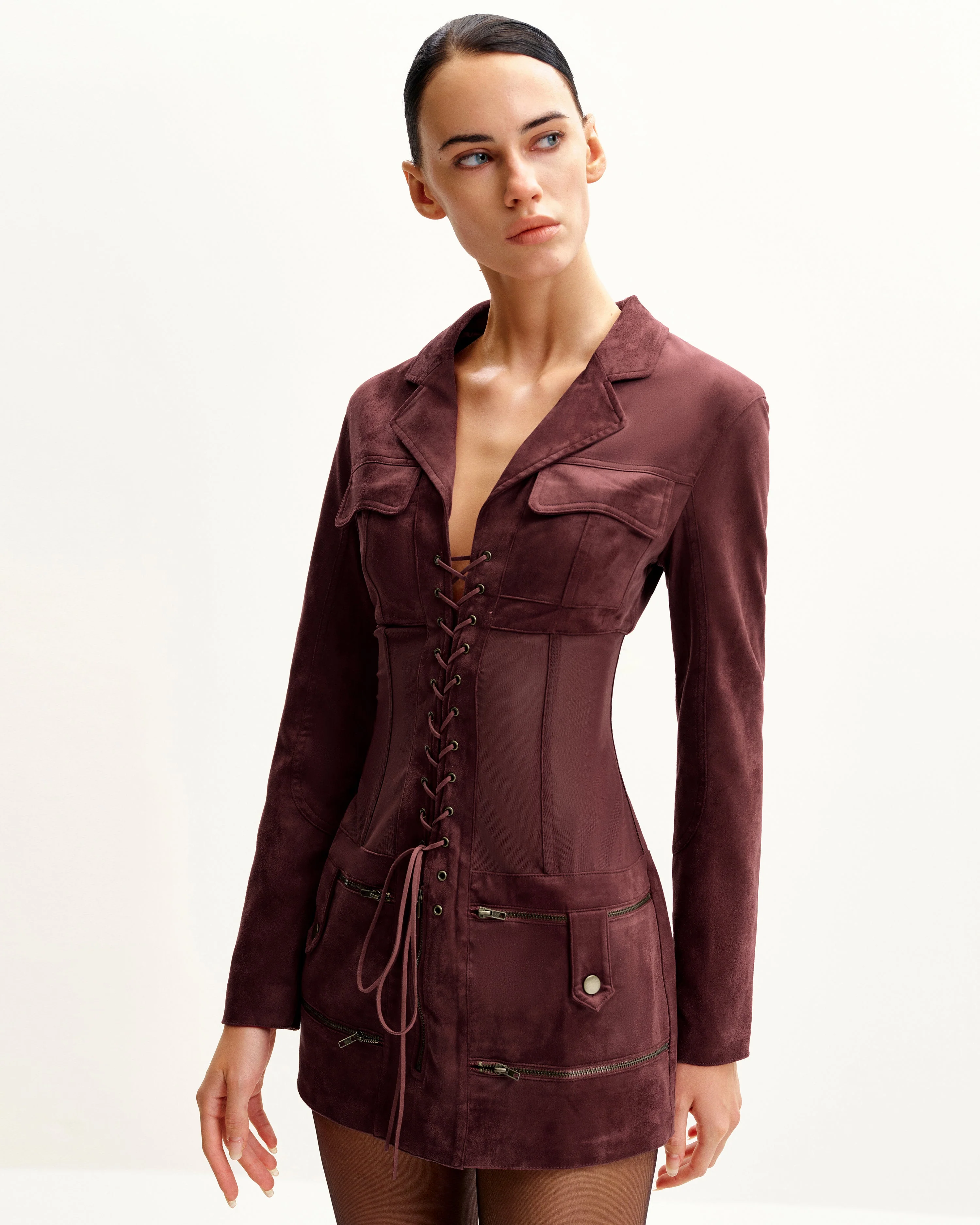 Faux Suede Corset Jacket Mini Dress - Claret