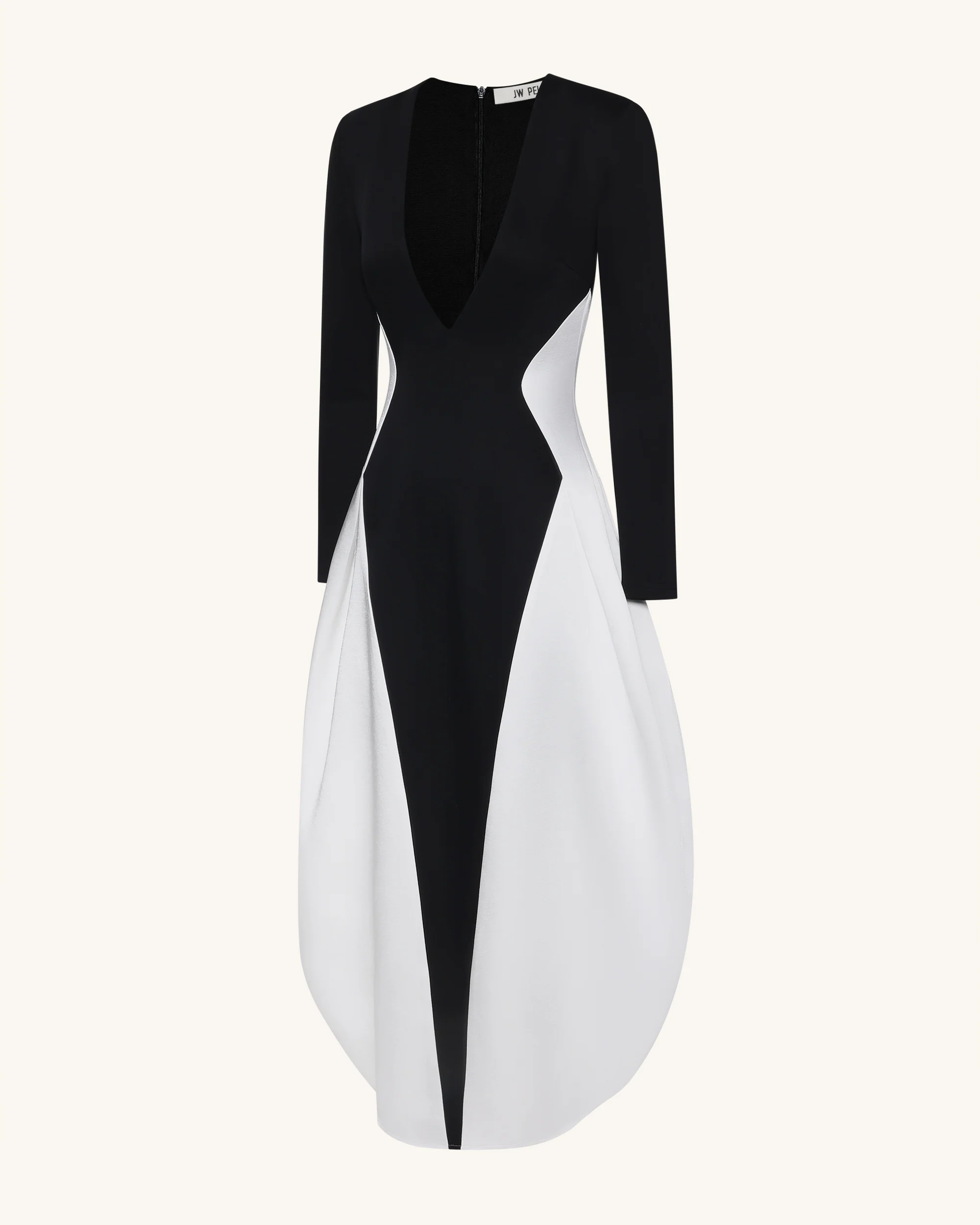 Monochrome Paneled Plunging V-Neck Long-Sleeve Maxi Dress - Black