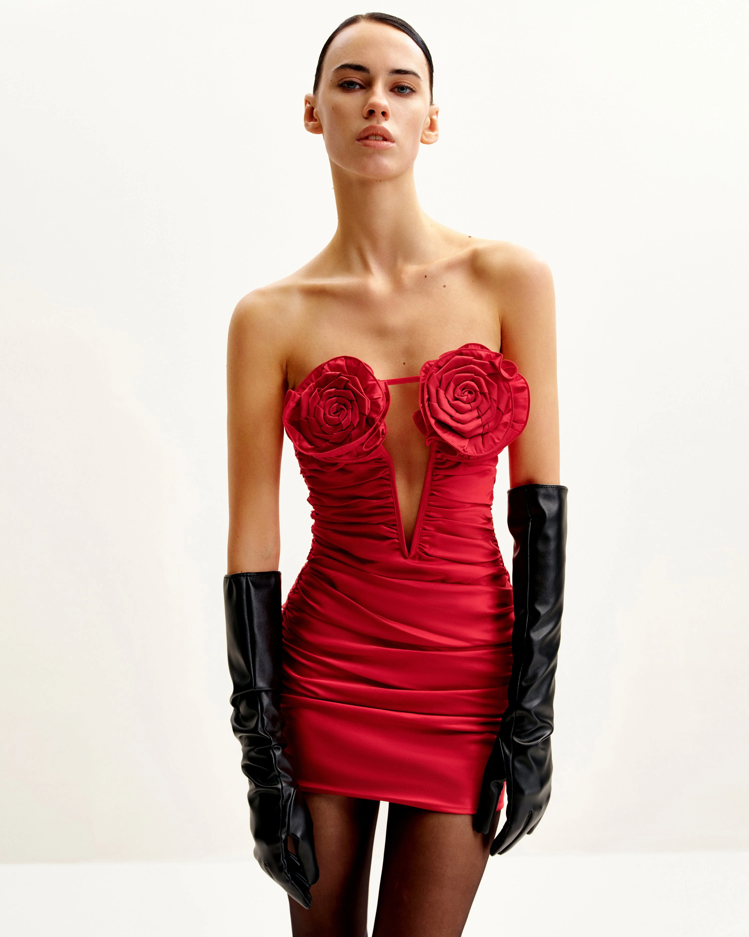Bailee Red Floral Applique And Ruched Tube Mini Dress - Red
