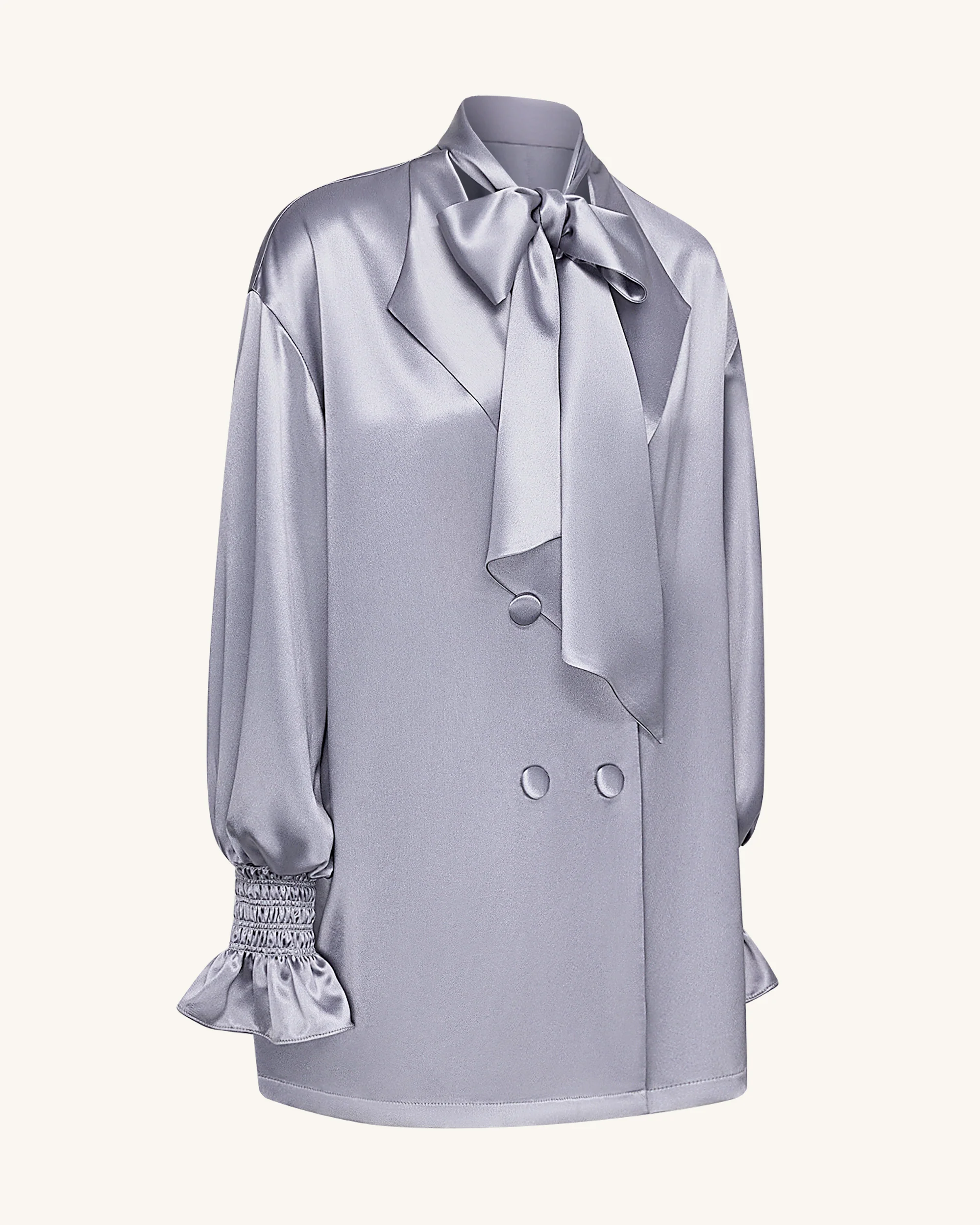 Ribbon Tie Balloon Sleeve Longline Blazer - Silver