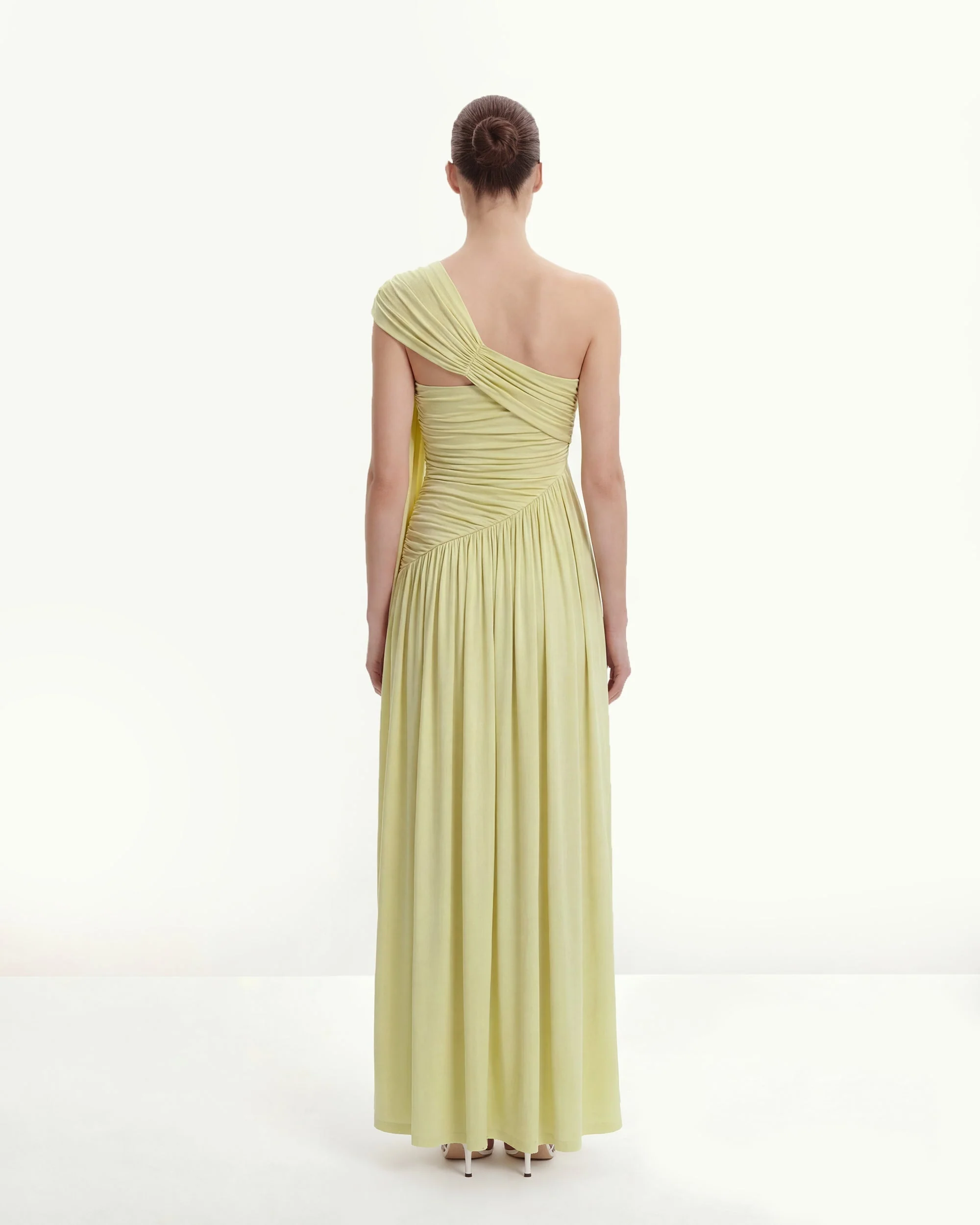 Ruched One-Shoulder Maxi Dress with Trailing Sash - Green